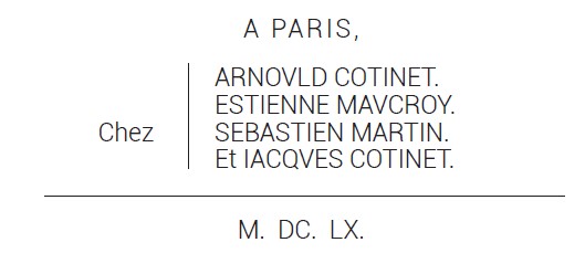 No sabemos cuántos ejemplares se tiraron en esa edición de 1660, pero probablemente fueron muchos. Entre los manejados hemos encontrado uno que tiene un pie de imprenta peculiar, con fecha de 1669 ( ver imagen más abajo): «A Paris, Chez Michel Bobin & Nicolas Le Gras, M. DC. LXIX» [1669] (ejemplar de la Bibliothèque Universitaire de Rennes 2, signatura 55587). Podría pensarse que es otra edición realizada por el mismo Bobin que participó en la de 1660, pero no: el cuerpo es el mismo y al final del volumen se encuentra el mismo colofón que aparecía en la edición de Maucroy 1660: