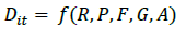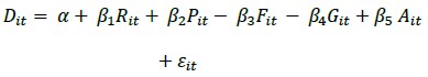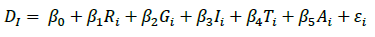 La magnitud del desplazamiento en el municipio i depende (Di), como se deduce, de la forma reducida desarrollada en la sección anterior, del atractivo económico que ofrece el municipio para los actores armados (Ri), de factores de exclusión que facilitan atraer simpatizantes a la causa insurgente (Gi), de la fortaleza de las instituciones existentes en el municipio (Ii) y de características de los municipios que pueden propiciar el surgimiento de grupos armados (Ti). Por último, las acciones de los grupos armados determinan la magnitud del desplazamiento (Ai). El modelo asume que la función de desplazamiento para cada uno de los municipios es idéntica y está definida por