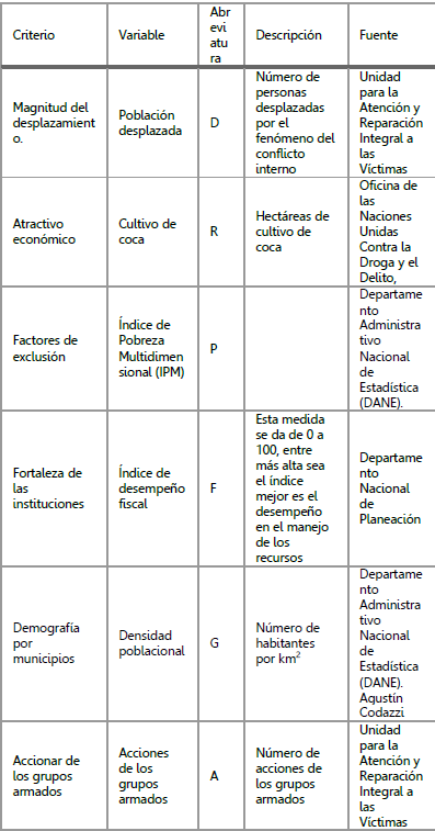 Dentro de la investigación, se desarrolla un enfoque que analiza algunos factores que influyen en el desplazamiento, en un tiempo específico estudiado: 2008 al 2013. Estos factores son: víctimas, incentivos económicos para los grupos armados, fortaleza de las instituciones en cada municipio del departamento, las acciones de los grupos armados y la densidad poblacional en cada uno de los municipios.