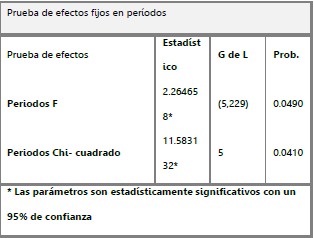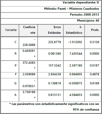 Análisis de efectos fijos sobre el desplazamiento en Norte de Santander. El modelo de regresión de datos panel permite identificar la existencia de efectos fijos entre los municipios o a lo largo del tiempo. Los resultados del análisis de efectos fijos se presentan en la tabla 3. Teniendo en cuenta que los datos estadísticos de prueba son significativos, se evidencia la existencia de efectos fijos entre los municipios, a lo largo del periodo analizado, para explicar la magnitud del desplazamiento.