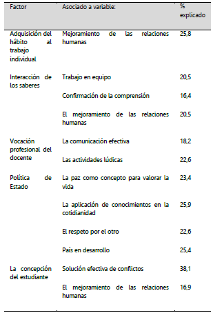 El análisis jerárquico y correlacional (tabla 1) muestra cómo la concepción del estudiante explica la solución efectiva de conflictos en un 38,1%; al considerar el enfoque una política de Estado con respecto a la aplicación de los conocimientos adquiridos en la cotidianidad: la adquisición de hábito al trabajo individual, , en un 25,9%; el mejoramiento de las relaciones humanas en los jóvenes en un 25,8%; la interacción de los saberes en un 20,5%; el trabajo en equipo y la comprensión en 16,4% y en un 20,5% el mejoramiento de las relaciones humanas.