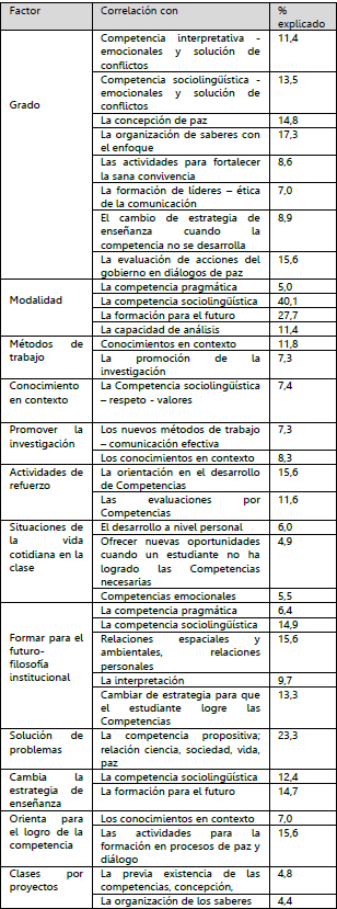El análisis causal y correlacional (p=0,01<0,05) (tabla 2) permitió evidenciar cómo el factor grado tuvo correlación significativa con la competencia emocional (explicada en un 21,3%); además la solución de problemas se pudo establecer a partir del desarrollo de competencias en ciencias a través del trabajo en equipo, filosofía institucional, se asoció al desarrollo de competencias en ciencias sociales y prácticas para la paz. Así mismo, las prácticas para la paz mejoró las estrategias utilizadas para la solución de conflictos (8,9%), las concepciones de competencias en ciencias sociales (14,8%), la evaluación (15,6%), esta modalidad refleja en un 40,1% el desarrollo de la competencia sociolingüística y en un 5% la competencia pragmática, de manera que, variables como el grado, la modalidad y la estrategia en pro del fortalecimiento de la paz se correlacionaron con el desarrollo de las competencias emocionales y la solución de conflictos.
