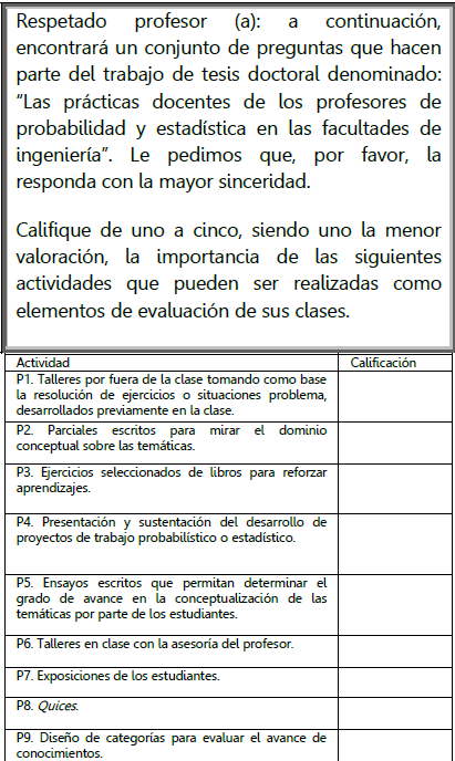Este instrumento permitió describir y analizar la estructura de las prácticas docentes en los espacios de formación en probabilidad y estadística, en las facultades de ingeniería en Bogotá, Colombia.