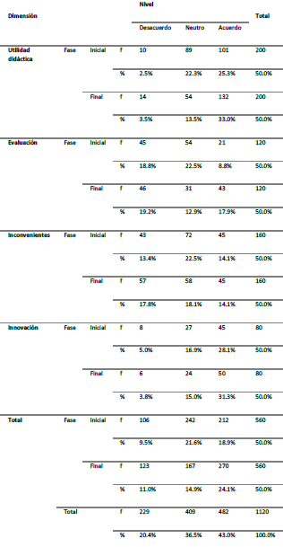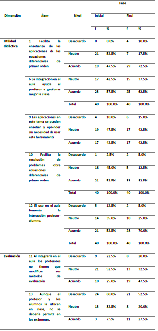 En la Tabla 2, se relacionan los ítems asociados a la dimensión utilidad didáctica y evaluación de la categoría proceso de enseñanza aprendizaje. Se evidencia un incremento significativo entre las fases, aproximadamente, el 22% en la valoración positiva, que alcanza, en la fase final, más del 70% del reconocimiento del potencial de la herramienta como recurso didáctico-tecnológico.