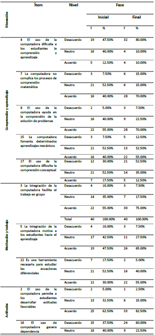 se aprecia que el uso de la herramienta resultó favorable para los estudiantes al aumentar en aproximadamente el 7%, los niveles de aceptación como medio para la comprensión del aprendizaje de las ecuaciones diferenciales. Por otra parte, cerca de un 12% los estudiantes que manifestaba dudas en la sesión inicial, se convencen favorablemente en la evaluación posterior a la experiencia. En esta misma tendencia, se relacionan los factores de motivación en el aula y el incremento entre las fases de una actitud favorable hacia el aprendizaje de las ecuaciones a partir de la incorporación en el aula de la computadora como recurso didáctico.