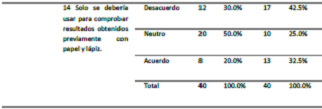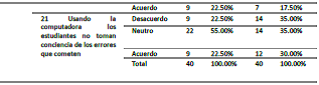 También se destaca que aproximadamente el 60% de los estudiantes descarta que el uso de la computadora genere algún tipo de dependencia; dicho de otro modo, la consideran como un instrumento que facilita el cálculo y la aplicación del concepto, pero queda claro que el dominio conceptual y la identificación de los distintos elementos y parámetros implícitos se identifican a partir del dominio conceptual y práctico del tema. En este sentido, una tercera parte de los estudiantes está consciente de que incluso usando la computadora se pueden cometer errores.