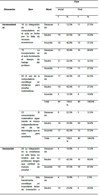 Siguiendo con el orden de las categorías, en la Tabla 3 se relacionan las distribuciones de frecuencia de las dimensiones inconvenientes e innovación de la categoría proceso de enseñanza aprendizaje. Estas dimensiones evalúan el uso de la herramienta en aspectos que trascienden la didáctica. Por otra parte, el uso de la computadora, una vez diseñada la inducción, no incrementaría el tiempo de trabajo del profesor, lo cual no se considera como una limitación por más del 60% del grupo. Un elemento que llama la atención es que solo el 40% del grupo considera que el conocimiento matemático sigue siendo el mismo, independientemente de las tecnologías que se usen para enseñarlo; esta opinión apoya la idea extendida de que la innovación tecnológica no sustituye la comprensión de los contenidos. La opinión de los estudiantes, con respecto a los cambios en el modo de enseñanza del docente después de la experiencia de la incorporación del uso de la herramienta, permanece invariante y se ubica alrededor del 48%. Por otra parte, un 78% no duda en señalar que esta herramienta constituye un importante factor de innovación y cambio en la formación superior.