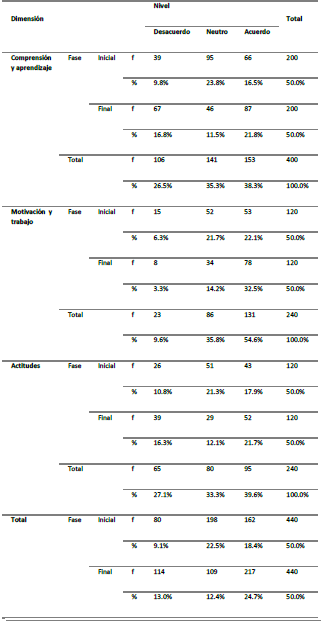 La Tabla 1 muestra las dimensiones comprensión y aprendizaje, motivación, trabajo y actitudes de la categoría alumno aprendizaje. Un primer aspecto de esta dimensión que se destaca, a primera vista, es la diferencia marcada en los cambios de opinión de los estudiantes entre la fase inicial y final.