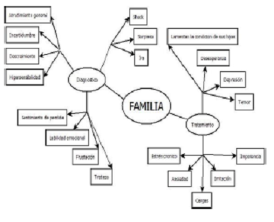 Hasta la aceptación final del diagnóstico, se vive algo parecido a las etapas de elaboración del duelo que Elisabeth Kübler-Ross (1989) estableció para explicar las reacciones ante la pérdida de un ser querido; en este caso se trata de la pérdida de un hijo "idealizado"; de hecho, las etapas que atraviesan los padres hasta la aceptación de la condición del hijo, son muy similares a las del duelo. Cuando los padres reciben el diagnóstico inicial, entran en un estado de inmovilización, de shock, de bloqueo y aturdimiento general.