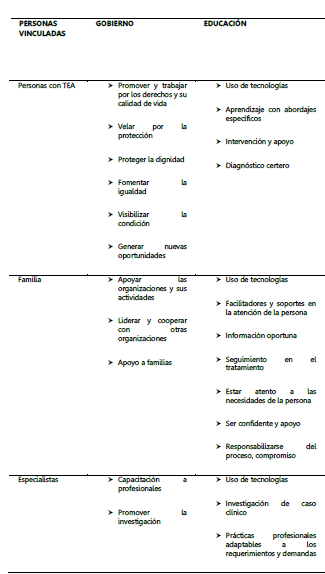 Educación. Al abordar la solución a las situaciones planteadas en relación con las necesidades de las personas con TEA y el comportamiento y las situaciones que enfrentan sus familiares, es relevante tener en cuenta el aspecto educativo enmarcado en elementos como el uso de tecnologías, la constante investigación del caso clínico y el dimensionamiento de esta población que desde la perspectivas de la estadística, permite dimensionar las necesidades de desarrollo tecnológico que sirva de herramienta y soporte en atención a la diversidad del desarrollo en estas personas.