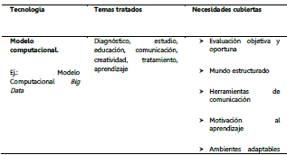 El modelo computacional es un medio flexible y adaptable que permite atender las necesidades particulares de cada paciente. Todas estas ayudas tecnológicas tienen una forma propia y particular de interactuar con la información, de forma tal, que son capaces de responder a diferentes casos de autismo y, en cada uno, dar respuesta de la mejor manera; adicionalmente es un método que apoya a lo largo del proceso, con la medición de los resultados alcanzados por el paciente.