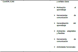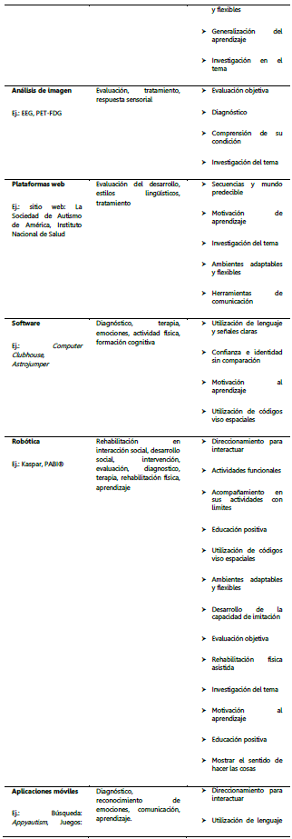 Finalmente, la tecnología se ha desarrollado para apoyar las necesidades, brindando herramientas en las diferentes áreas: inserción social, comunicación, aprendizaje, área cognitiva y área de autonomía, lo cual se puede sintetizar en el siguiente cuadro: