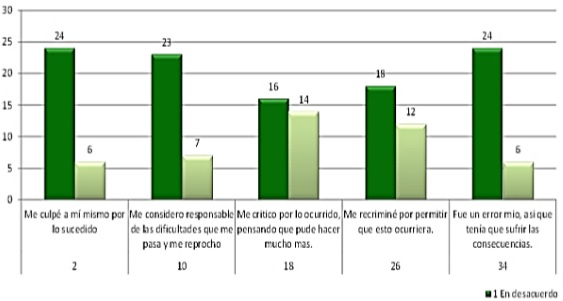 El 80% no se culpa por lo sucedido como víctima del conflicto, el 23% no se considera responsable de lo sucedido, el 16% no se critica de lo ocurrido, el 18% nunca se recrimino por lo ocurrido, el 24% considera que no fue error sufrir las consecuencias.
