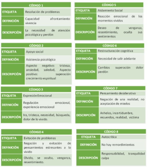 En procura del logro de los objetivos planteados en el artículo y de acuerdo con la información disponible, respecto de las experiencias vividas por los policías víctimas del conflicto (atentados, tomas subversivas, secuestro y emboscadas) y para la posterior elaboración de los instrumentos a emplear, se realizó la identificación y categorización de sentimientos desde la regulación emocional y la estrategia de afrontamiento de cada hecho vivido así: