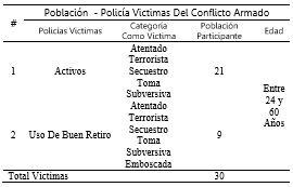 La población tomada como fueron treinta policías catalogados como víctimas del conflicto en el Valle del Cauca y la Metropolitana de Cali. La selección se realizó de forma aleatoria, de acuerdo a la disponibilidad de los policías para hacer parte del proceso investigativo.