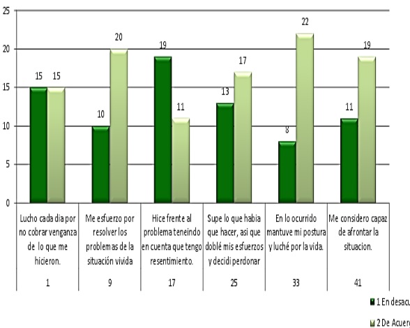 Se destaca de manera general en los resultados obtenidos que la mitad de los encuestados no experimentan sentimientos relacionados con la venganza frente a los hechos vividos, sin embargo la otra mitad de población lucha por no albergar resentimientos, la mayoría de los encuestados luchan constantemente por mejorar su vida, afrontaron la situación y se esfuerzan por resolver las problemáticas que se generaron después de los hechos ocurridos.