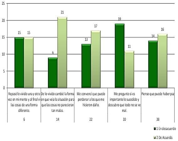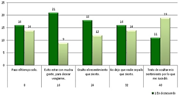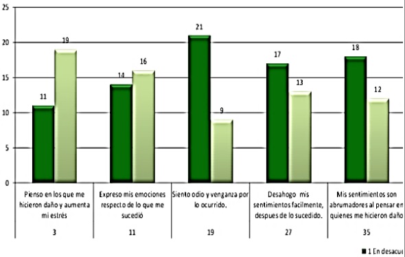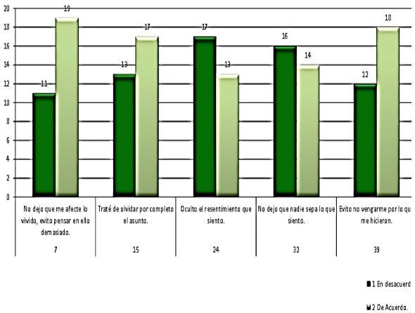 El 63% no le afecta lo vivido y evitan pensar en la situación, el 56% trata de olvidar lo vivido, el 43% ocultan su resentimiento hacia los victimarios, el 46% no dejan que sepan lo que sienten por lo vivido y el 60% evitan vengarse por lo que le hicieron.