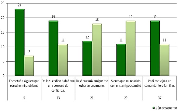 El 76% no encontraron quien escuchara su problema, el 63% no hablaron con personas de su confianza sobre sus sentimientos y problemas, el 60% permitió la ayuda ofrecida por un amigo y el 63% nunca pidieron un consejo a un superior de la Institución policial o un familiar.