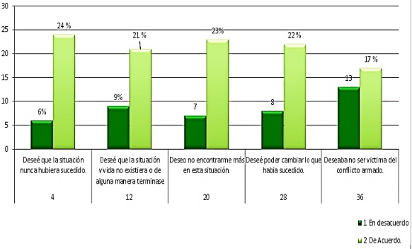 El 80% desean que la situación no hubiera sucedido, el 70% desearon que lo vivido fuera un sueño y si era real que terminara pronto, el 76% desearon no volver a vivir una situación similar, 73% desearon haber podido cambiar lo que habían vivido y el 56% deseaban no se víctimas del conflicto armado.