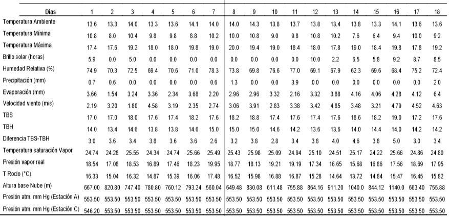 Para la estimación del Error Cuadrático Medio (ECM) se tomaron las mediciones realizadas en 2 estaciones de calidad del aire, ubicadas en el Hospital de Santa Martha y la planta de MILPA (ubicada en la vereda La Chorrera) los cuales tienen mediciones de 18 días consecutivos, correspondientes a los días del 1 al 18 de mayo de 2012, como también los datos meteorológicos diarios de la estación de Villa Carmen y se correlacionaron con los de la estación de la UPTC de Tunja (Tabla 2) y con los criterios de Doorembos (1976), Henderson and Perry (1979) se calcularon las alturas de las nubes.