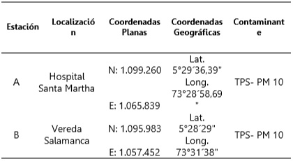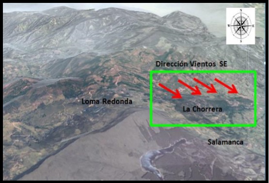 El escenario del estudio está constituido por el entorno del Valle de Samacá, Veredas La Chorrera y Salamanca Figura 1, que corresponden a las zonas de influencia donde se ubicaron las estaciones de monitoreo, con la finalidad de tener un diagnóstico preliminar del comportamiento de los PST y PM10 de la zona productora de carbón y coque del municipio de Samacá. En cada punto se determinan las coordenadas y altitud, lo que permite representar el efecto de la topografía en la dispersión. La vereda Loma Redonda es un llano ubicada en la cima de la formación montañosa del páramo de Rabanal en donde el viento corre a velocidad lineal constante, la vereda Chorrera ubicada en la ladera del páramo origina efecto de turbulencia en el movimiento del viento y la vereda Salamanca es un llano en la base de la montaña presenta afectación en los procesos de dispersión por efecto de turbulencia del viento y recibe mayor resuspensión de material particulado emitido.