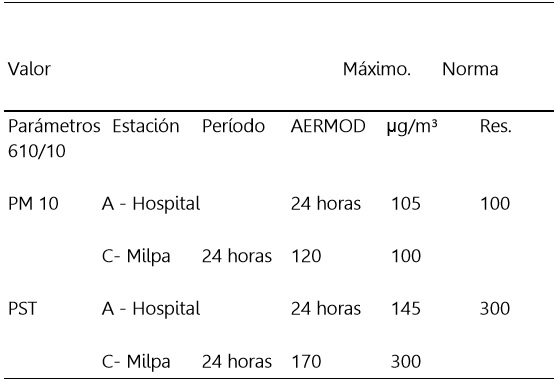 El modelo evaluó promedios de 24 horas para los parámetros PM10 y PST, las fuentes de emisión y receptores potenciales, llegando a la siguiente estimación proyectada (ver Tabla 3):