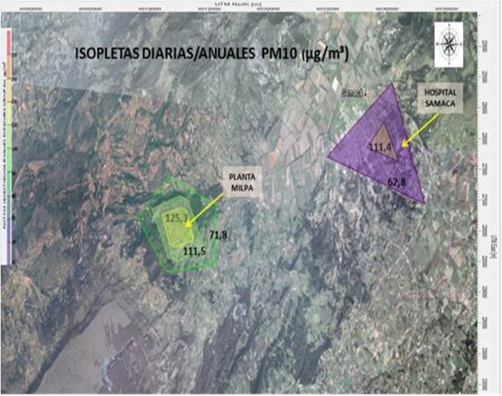 La modelación muestra que las concentraciones diarias de PM10 encontradas en el segundo pico, sobre la Planta de Milpa (La Chorrera), se mantiene constantes, debido a la influencia de los hornos de coque de esta zona. Sin embargo, se encuentran concentraciones altas de 83,028 μg/m3, lo cual significa que es necesario tomar otras medidas con el sector artesanal como implementar turnos de producción. Las concentraciones sobre la Planta de Milpa (primer pico) siguen siendo altas, lo cual significa que a pesar de que se tomen medidas en el sector de producción de coque, es necesario que la autoridad ambiental (CORPOBOYACA) ejerza control en el monitoreo de emisiones fijas, como también las móviles. En la Figura 3 se detallan las isopletas diarias y anuales de toda el área modelada. Es importante tener en cuenta que los datos que se muestran a continuación, no corresponden a la concentración final ya que no tienen incluida la concentración de fondo diaria y anual.