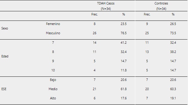 De esta base de datos se extrajeron 68 dibujos de la figura humana, pertenecientes a 34 casos y 34 controles, bajo los siguientes criterios de inclusión: edad de 7 a 10 años, escolarizados y que no hubieran dibujado caricaturas o palotes; un C.I estimado ≥ a 85, usando una forma breve del WISC III con las subpruebas de vocabulario y diseño con cubos y derivando el estimado de los cocientes de desviación de la escala total (Sattler, 1992), así como diagnóstico de TDAH según la entrevista psiquiátrica semiestructurada Mini International Neuropsychiatric Interview para Niños y Adolescentes (MINI Kid); y para los controles que estuviera reportada la ausencia del trastorno.