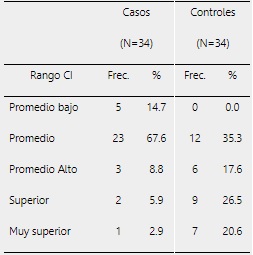 Al examinar dicha distribución por tipo de participante, en el grupo de casos, dos terceras partes de los participantes tiene un CI promedio, mientras que en los controles al nivel promedio sólo pertenecen algo más de un tercio de los participantes. También es de destacar que en el grupo de controles no hay participantes que tengan un CI en el promedio bajo y cerca de la mitad de la muestra posee promedios superiores o muy superiores.