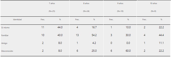 De acuerdo a la identidad atribuida a los dibujos, se encontró que los niños que dibujaron a sus familiares lo hicieron de acuerdo al género. Los varones dibujaron al padre, hermano y tío y a su vez, las mujeres dibujaron a la madre, hermana, prima y abuela. En general los dibujos representaron al cuidador del mismo sexo, manifestando relaciones identitarias. De igual forma, a medida que la edad se incrementa, la figura elegida por el niño se aleja de la propia identidad y el círculo familiar, correspondiendo a patrones de socialización secundarios y a la fase de socialización operativa-concreta de 7 a 11 años según Piaget (1989).