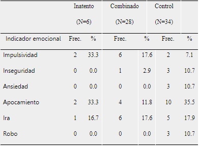 Este indicador fue inesperado, en comparación con agresividad/ira, ansiedad, e impulsividad, los cuales estuvieron presentes en menor frecuencia, pues se esperaba encontrar que los dibujos estuvieran marcados con elementos como dientes, sombras, brazos largos e integración pobre; sin embargo, la diferenciación entre los subtipos combinado e inatento, sugirió que el primero presentaba mayor frecuencia para apocamiento e ira, mientras que en el inatento lo son el apocamiento y la impulsividad