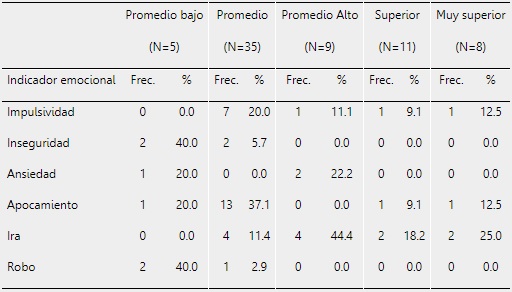 Al examinar por cada uno de los niveles de CI, se observa que en ninguno de ellos hay presencia de indicadores emocionales que alcance la mitad de la muestra. En el caso del nivel promedio bajo, la inseguridad y el robo son los indicadores de mayor representación; en el nivel promedio lo es el apocamiento; y en el nivel promedio alto, superior y muy superior lo es la ira. Al establecer si existe asociación entre alguno de los indicadores y el nivel de CI, los indicadores inseguridad (p=0,015 – Coef. de contingencia=0,391), ansiedad (p=0,016 – Coef. de contingencia=0,389) y robo (p=0,002 – Coef. de contingencia=0,442), exhibieron dependencia con un grado de asociación moderado