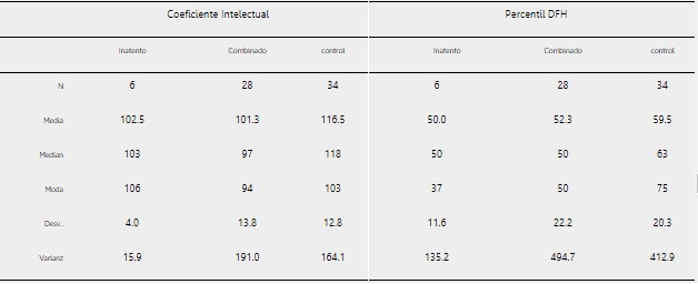 De acuerdo con los resultados, se pudo establecer una diferencia estadísticamente significativa (p=0,000) del C.I, entre ambos grupos, a favor del grupo control, ya que en este se observó una tendencia a obtener C.I más altos, a pesar de que para toda la muestra, uno de los criterios de inclusión fue tener un CI estimado igual o mayor a 85. Lo anterior coincide con investigaciones realizadas en países hispanohablantes como la de Barros (2002) y Maganto (2009) donde se encontraron diferencias en la elaboración de DFH entre niños con conductas problemas incluyendo el TDAH y la relación proporcional entre el CI y la ejecución gráfica. En los resultados de la presente investigación se concluyó que sólo el subtipo combinado tenía participación en el rango de CI promedio bajo; sin embargo, otros estudios conocidos como el de Schuck y Crinella ( 2005) aseveran que suele ser habitual que el alumno con TDAH tenga una capacidad intelectual media o por encima de la media, encontrándose incluso, casos de sobredotación intelectual y altas capacidades; así mismo en un estudio del Instituto Nacional de Salud Mental (NIMH ), se informó que los resultados de la aplicación del WISC III a 579 niños con TDAH, arrojaron una media del CI que no difería a la del grupo control. Ambos resultados contradicen los hallazgos del presente estudio.