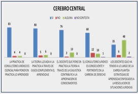 Se realizaron cinco preguntas desde el cerebro central (operativo). Los resultados con relación a las estrategias en el proceso de enseñanza y aprendizaje implementados en el programa de derecho, con tendencia al desarrollo de las funciones correspondientes al cerebro central, muestran que el 88% de los estudiantes considera que la teoría debe ser llevada a la práctica para complementar el aprendizaje, el 83% considera importante que se utilice la casuística para poner en contexto la teoría, y el 74% de los estudiantes cree que el consultorio jurídico es pertinente en la carrera de derecho.