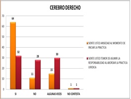 Desde el cerebro derecho (emoción) en cuanto a las estrategias para el proceso de enseñanza y aprendizaje con tendencia derecha, se establece que la expectativa frente a lo que es el desarrollo de la práctica jurídica, genera en el estudiante sensaciones de ansiedad y temor, al poner en práctica lo aprendido. De allí, que el 70% de los estudiantes sienten ansiedad al iniciar la práctica y el 63 % de los estudiantes sienten temor al asumir la responsabilidad que genera la práctica jurídica.
