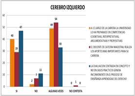 Se aplicaron en la encuesta tres preguntas desde el cerebro izquierdo (lógico), Los resultados frente a las funciones correspondientes al cerebro izquierdo, muestran que de los 91 estudiantes encuestados, el 50% advierte que a través de la enseñanza-aprendizaje del derecho se desarrolla en ellos competencias cognitivas e interpretativas, dada la formación teórica del derecho a través del paradigma tradicional de la cátedra magistral, en donde el docente es el centro de atención, poco aporta para el ejercicio práctico del derecho y tal situación se agudiza cuando las evaluaciones se centran en la memorización de conceptos y no en la aplicación de los conocimientos a situaciones reales y prácticas.