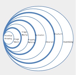 Una representación diagramática del modelo para la evolución de la comprensión matemática, en el cual los límites de falta de necesidad están representados por los aros más gruesos.