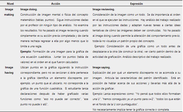 •Nivel 3. Comprensión de la imagen. En este nivel, el estudiante se ve en la necesidad de reemplazar las imágenes asociadas a una sola actividad, por imágenes mentales. El desarrollo de tales imágenes mentales que no son más que imágenes orientadas por un proceso, libera al estudiante de las matemáticas a partir de la necesidad de realizar acciones físicas particulares (Pirie y Kieren, 1992). Aquí, el estudiante comienza a reconocer las propiedades globales obvias de las imágenes matemáticas inspeccionadas.