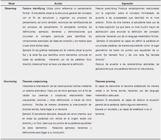 •Nivel 6. Observación. El estudiante utiliza su pensamiento formal, es decir, produce verbalizaciones relacionadas con la cognición sobre el concepto formalizado, es capaz de combinar definiciones, ejemplos, teoremas y demostraciones para identificar componentes esenciales, ideas de conexión y los medios para relacionar dichas ideas.