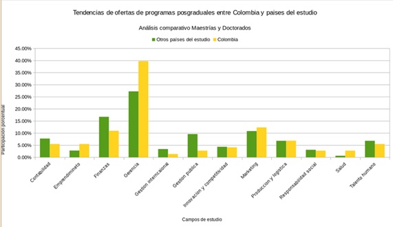 Para el caso de los campos de estudio, los programas posgraduales tienen una tendencia en consonancia con las necesidades del mercado laboral y académico de cada territorio. Sin embargo, es evidente el desfase o la falencia existente en algunos campos de estudio. En Colombia por ejemplo, campos de estudio como emprendimiento, gestión pública, responsabilidad social o gestión internacional presentan déficit de oferta en comparación con otras opciones como finanzas o talento humano.