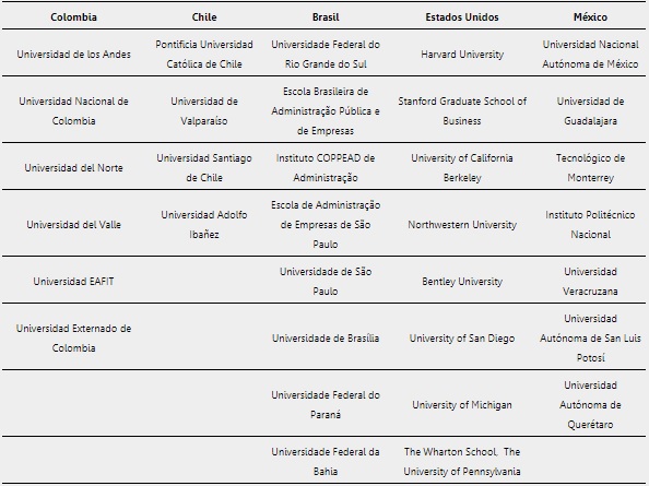 Este fue una investigación documental en la que se analizaron documentos institucionales públicos registrados en las web oficiales de las facultades seleccionadas. Se utilizó como criterio de selección de los países a contrastar con Colombia el trabajo antes mencionado de Mendoza Lemus et al. (2012); dicho estudio permitió identificar los países del continente americano con programas de posgrado en Administración reconocidos por su calidad, temática y pertinencia. Posteriormente, se seleccionó una muestra de siete facultades por cada país, basándose en el trabajo de Buitrago y Cardona (2012). Las Universidades o facultades seleccionadas en los países subsumidos se presentan en la Tabla 1.