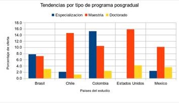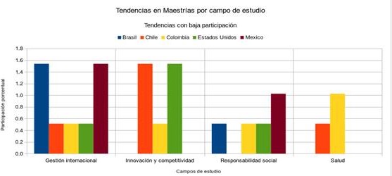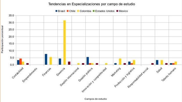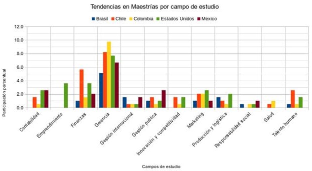 Brasil y Colombia poseen la mayor oferta de programas en algunas de las áreas con respecto a otros países donde dicha oferta es mínima. Entre dichas tendencias se podría destacar primero Brasil. Este país cuenta con mayor porcentaje de oferta de programas en finanzas con el 7,6%. Seguido por Colombia con el 5,4%. Segundo, la tendencia en gestión pública la cual es ofrecida mayoritariamente en Brasil con el 60% de los programas en este campo. En contraste con Colombia, México y Chile una mínima oferta del 1% cada uno. Tendencias de oferta en Maestrías por campo de estudio.