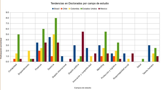 En el campo de los doctorados, se presentan resultados similares a los de Maestría y Especialización. Se hace evidente un mayor enfoque en programas doctorales en Marketing, Gerencia y Finanzas y un déficit en Administración en Salud, Gestión pública, Gestión internacional y Emprendimiento. Estados Unidos y México lideran la oferta en doctorados y por ende son los países con una oferta más diversa en campos de estudio seguidos por Brasil, Colombia y en último lugar Chile.