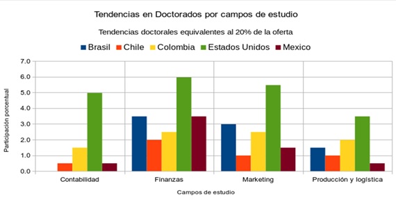 En comparación, México, Brasil y Estados Unidos se interesan más por la oferta doctoral. Dicha tendencia se ve reflejada en las implementaciones y avances en la disciplina Administrativa y en las diferentes escalas del diseño de las Organizaciones.