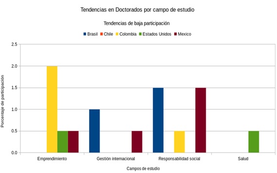 Por último, Colombia posee una tendencia de investigación a destacar en Emprendimiento a nivel doctoral, aunque no corresponde esta área a las de mayores ofertas. Esta tendencia es contraria a la presentada en el apartado anterior en que era nula la oferta en Maestrías en emprendimiento. Es probable que esto se deba a que en las últimas décadas los gobiernos en Colombia han demostrado un marcado interés por la creación de nuevas empresas como medida para combatir el desempleo y la baja remuneración en los salarios. Nuevamente se hace evidente el rezago que se presenta en la en investigación en gestión pública.