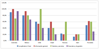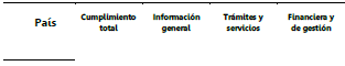Los países más destacados fueron Colombia y México, teniendo en cuenta que sus portales alcanzaron un cumplimiento superior al 80%, esto se debe en gran parte a que no solo obtuvieron buenos resultados en la categoría de información general y de trámites y servicios; sino que son administraciones que, de manera importante, revelan la información asociada con los temas financieros y de gestión, tal como se ilustra en la siguiente figura.