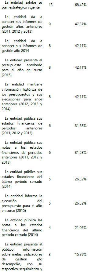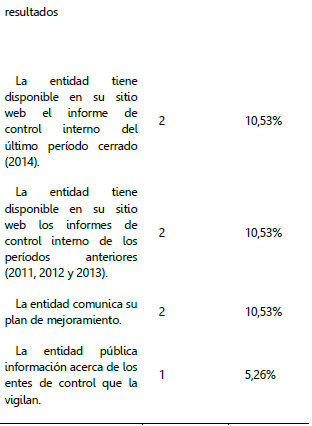 La tabla 4 muestra que existe un bajo nivel de divulgación de información financiera y de gestión, debido a que de los 15 aspectos, 10 presentan un puntaje por debajo del 39%, dejando en duda la responsabilidad de la entidad al rendir cuentas acerca del desempeño de su gestión y de la administración de los recursos disponibles para la institución. La falta de publicación de esta información restringe en los ciudadanos la posibilidad de llevar a cabo un control efectivo en cuanto a la consecución de los objetivos y metas trazadas en la gestión y en la aplicación y uso de los recursos asignados a la entidad.