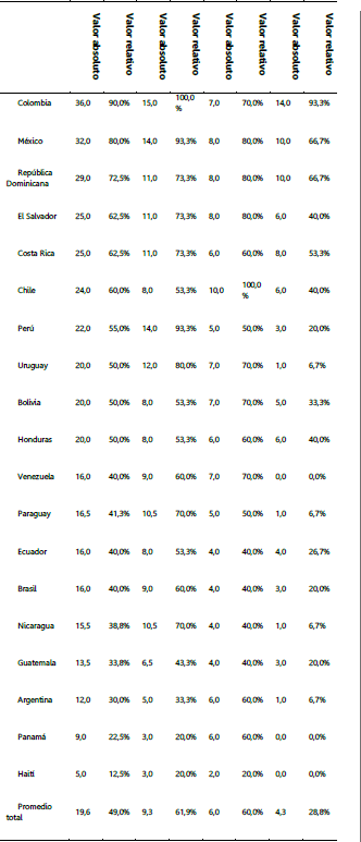 Una vez obtenidas las puntuaciones para cada aspecto, se agregaron los resultados calculando el valor absoluto y relativo en cada uno de estos, lo cual permite, en primera instancia, determinar el un ranking de acceso a la información, el cual es útil para evidenciar las prácticas en materia de revelación de la información por parte de cada institución y muestra los vacíos en los cuales estas podrían avanzar en materia de gobierno electrónico.