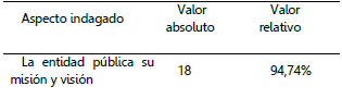 En la tabla 2 se muestra que los aspectos con mayor acceso a información son las asociadas con la publicación de la misión y visión, localización física y teléfonos de contacto y presentación del organigrama con porcentajes del 94.74%, 92.11% y 89.47% respectivamente.