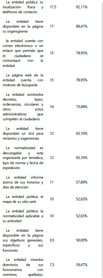 Los aspectos indagados en los sitios web se evalúan con “1” cuando se tuvo acceso a la información y con “0” cuando no existía la información (Cooke, 1989; (Católico, 2012; Lara, Gómez y Toledo, 2012). No obstante, para los aspectos asociados con el acceso a los objetivos generales, específicos y funciones, la publicación de su localización física y teléfonos de contacto y la exposición de su directorio de funcionarios con nombres, apellidos, cargos, números de teléfonos y extensión, se evaluaron considerando, adicionalmente, una nota parcial de “0.5”, ya que aunque no se cumpla con la totalidad de la información que se indica en cada aspecto, las entidades pueden llegar a reportar esta información de manera parcial.